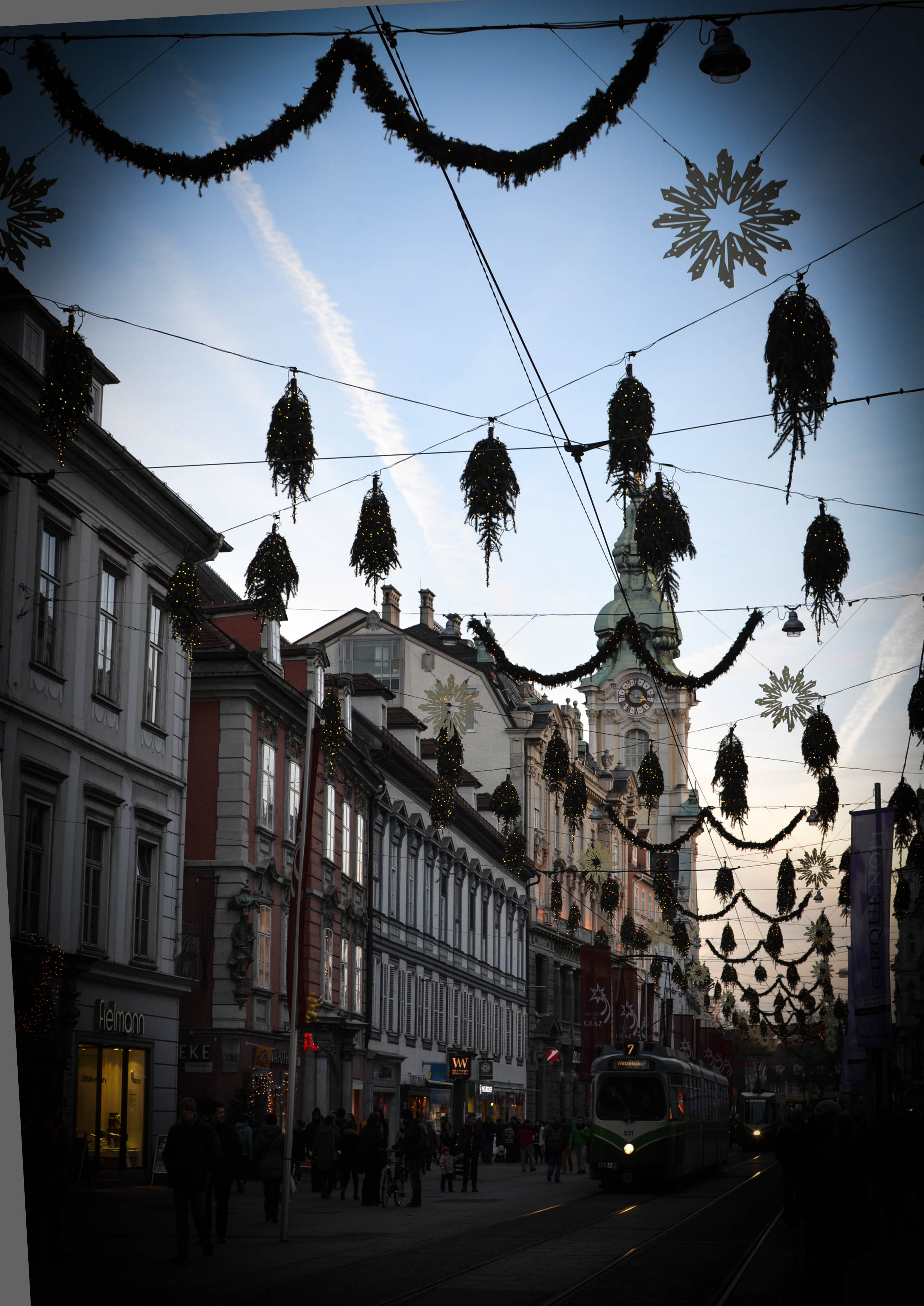 Our favorite Christmas market, however, was the atmospheric Aufsteirern Weihnachtsmarkt on the Schlossberg hill. Accessed by a number of steps, a futuristic glass elevator and a modern funicular, the old ruined fortress straddled a small, forested mountain that literally rose up from the city’s center. The market was staged inside the open-air bowels of the castle that were hewn from the mountain itself. Inside, lanterns and chains of lights set the room aglow as carolers in Tyrolean hats shared table space with visitors who clutched steaming mugs of glühwein (mulled wine, with our without a shot of brandy) and glühmost (mulled cider). Various folks had staged their wares in niches in the castle wall; one served raclette, a Swiss style of cheese melted inside its rind, scraped onto toasted dark bread and topped with fried onions; while another browned Käsespätzle, fresh German-style egg noodles, cheese and browned onions in a large iron pan. In another little alcove, Oliver and Kendley rolled, baked, decorated and bagged a dozen Christmas cookies while we waited.